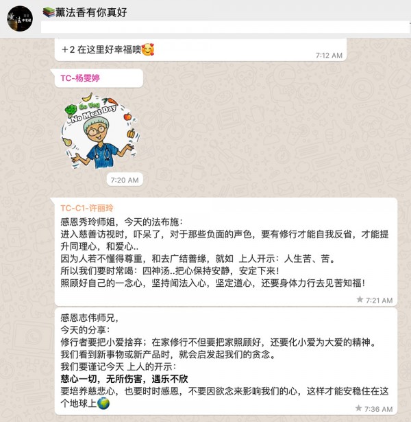 “薰法香有你真好”手机通讯群组中,大家陆续分享法喜,彼此勉励。(荧幕截屏 / 黄福顺)