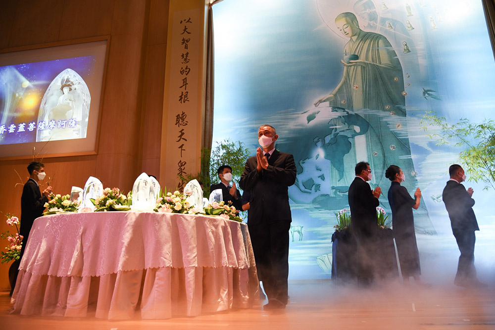 佛堂的浴佛台上,一尊尊宇宙大觉者琉璃佛像明亮庄严,薄雾缭绕,道气十足。《炉香赞》音乐响起,人人虔诚合掌,十八位献供人员缓缓行入佛堂,带领献供。