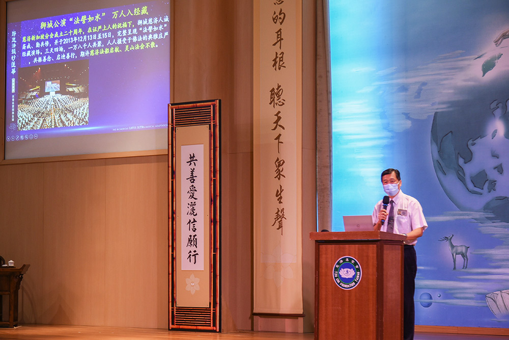 以2013年“法譬如水”经藏演绎的盛况,陈昭云期勉慈济人把握入经藏的殊胜因缘,步步踏实行入法华菩萨道。(摄/ 曾美珍)