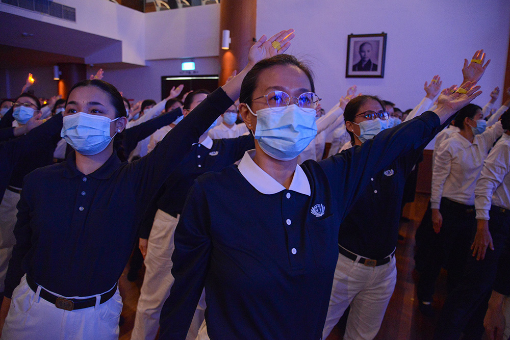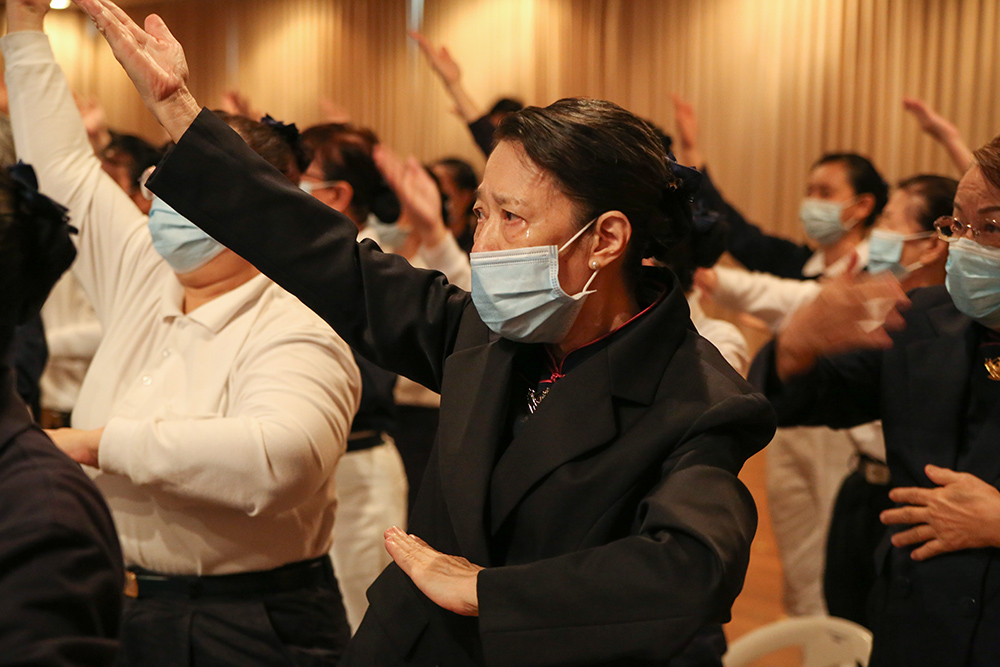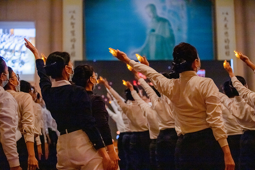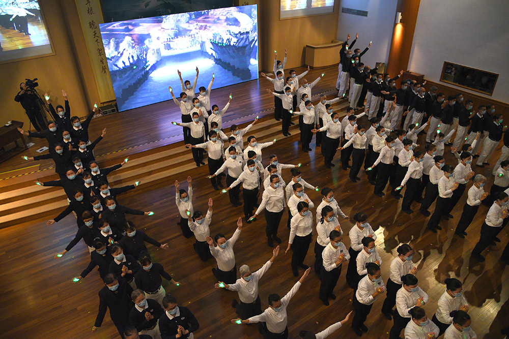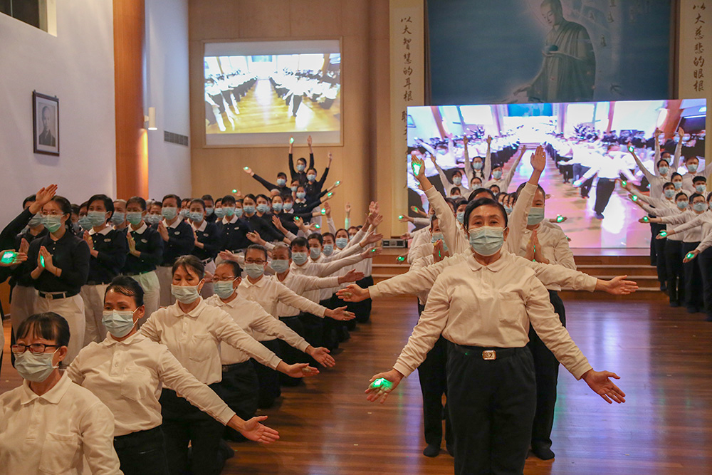 纵然远在新加坡,仅靠着一台18平方米LED大荧幕实时转播,志工时而起立比划,时而随着〈无量义经〉偈颂和《法华经》梵呗唱诵,虔诚之声绕梁。