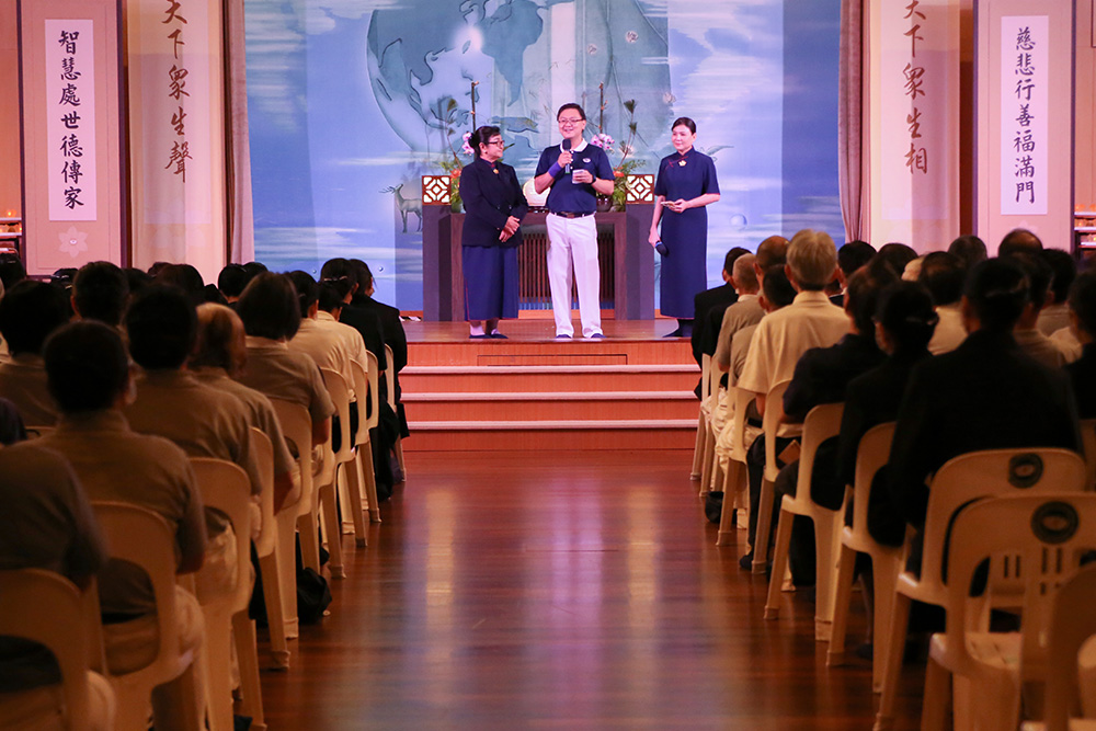 站在岁末祝福会场的舞台中央,身后站着七八位中区志工作为信心后盾,分享时蔡雅香不时回头看着大家,感恩精舍德柃师父每日上线陪伴薰法和中区团队的支持。