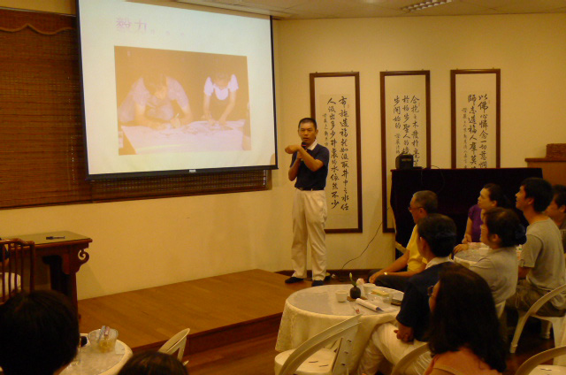 张会刚则分享了他和慈济社教课程的因缘际会。他因身体检查而接触了慈济,之后就常到住家附近的静思堂去看书。细心的社教志工陈碧燕因在慈济健检暨义诊中心的一面之缘注意到他,主动与他聊天,了解到他非常有心做慈济。会刚师兄的工作性质是每天上班,不上班就扣薪金,但他甚至会请假去做环保。于是,碧燕师姊就请他一起承担彩墨画班的随班志工。